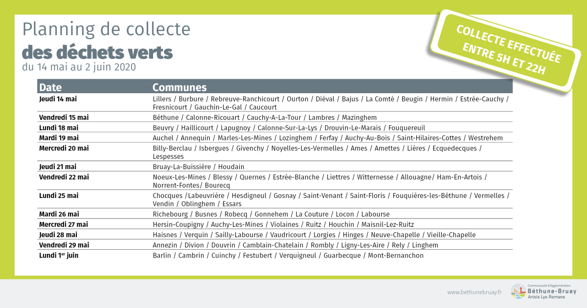 - A compter du lundi 18 mai, sans rendez-vous, la déchetterie « gros volumes » de Béthune sera à nouveau accessible à tous : professionnels, services techniques des communes et particuliers. Les paiements en espèce, resteront interdits, seuls les chèques et les facturations mensuelles seront acceptés.