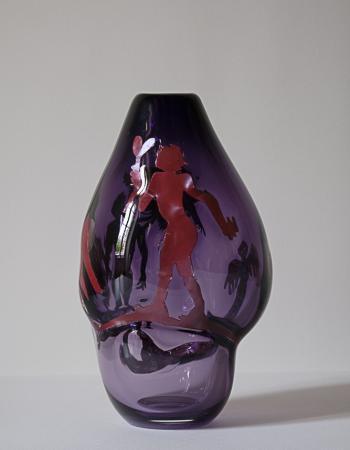Didier Tisseyre travaille la forme du vase comme une surface à raconter. Le verre devient pour lui une surface d’expérimentation. Ses figures filiformes, silhouettes suspendues, habitent l’objet comme un théâtre intime. Lentement, elles deviennent figures, personnages, oiseaux, fragments d’histoires. Ses personnages semblent être pris dans la masse, flottants, où s’installent entre eux un dialogue silencieux.