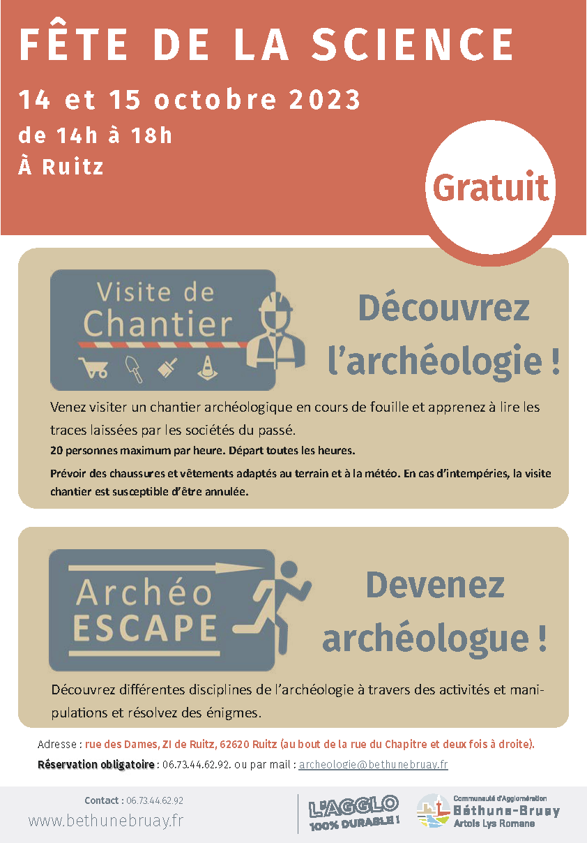 A l'occasion de la fête de la science du 6 au 16 octobre 2023, le service archéologie de l'Agglo organise des animations les 14 et 15 octobre prochain à Ruitz.