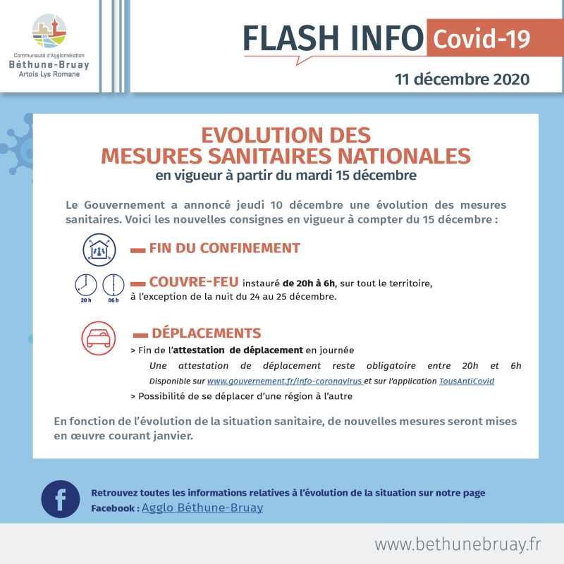Info Covid-19 : Mesures sanitaires nationales Afin de lutter contre la progression du virus, le gouvernement adapte les mesures sanitaires. Publié le 29 octobre 2020 Retrouvez ci-dessous les principales mesures annoncées le jeudi 10 décembre 2020 par le gouvernement. Precedent Retour à la liste Suivant