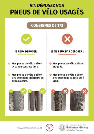 - sont uniquement acceptés et valorisables les pneus de vélo qui ont la bande centrale lisse ou des crampons inférieurs à 3 mm.