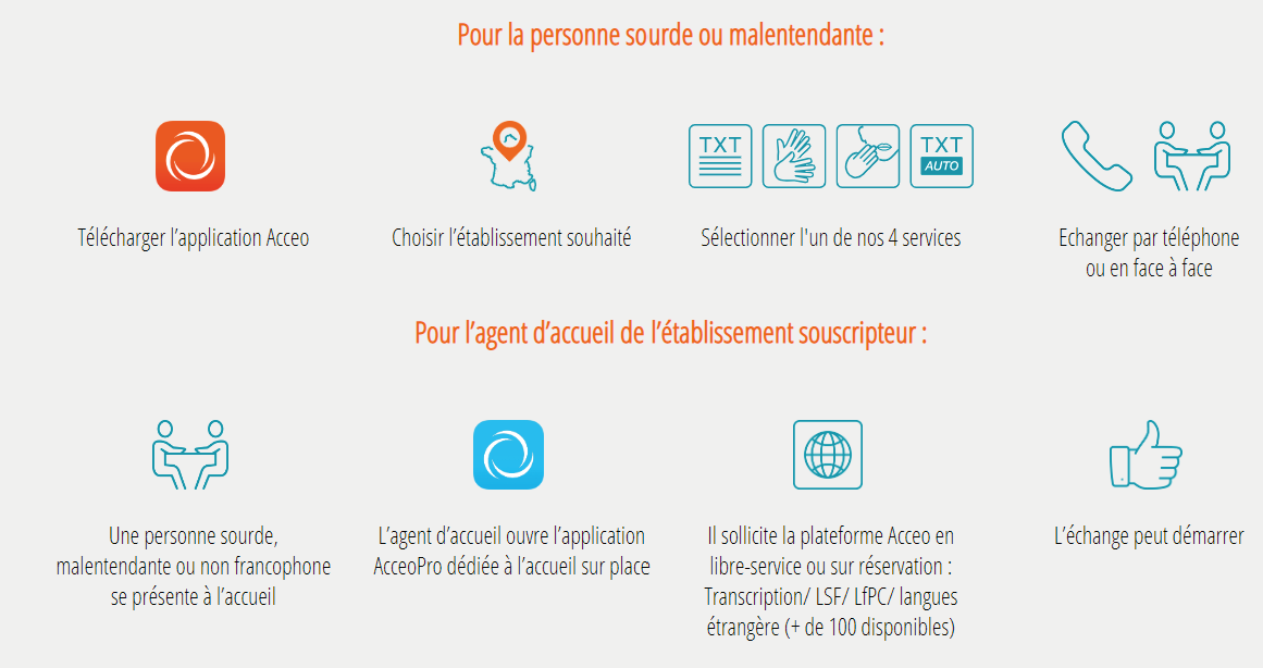 Dans la continuité de la dynamique de la Charte Handicap et afin de favoriser l’accessibilité des services publics à tous et notamment aux personnes sourdes et malentendantes, la Communauté d’agglomération a fait le choix d’adhérer au dispositif Acceo. Sur le territoire, le choix a été fait de rendre accessibles à la fois les établissements intercommunaux mais aussi l’ensemble des services communaux (mairie et éventuellement ses annexes, médiathèque, CCAS, agence postale communale, crèche municipale, services techniques…).