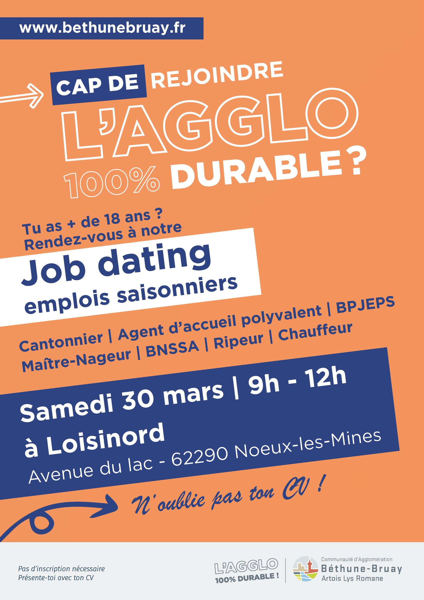 La Communauté d’agglomération organise un job dating pour ses besoins saisonniers le samedi 30 mars au stade de glisse de Loisinord. Intéressé(e)? Toutes les infos par ici !