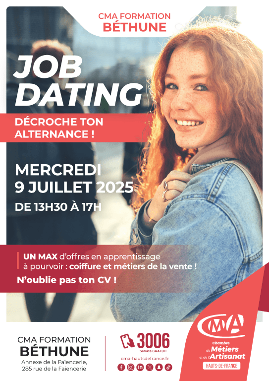 Tu veux te former dans l’artisanat tout en étant rémunéré ? Viens décrocher ton contrat en apprentissage dans l’artisanat pour la rentrée ! RDV pour le Job Dating le mercredi 9 juillet de 13h30 à 17h à CMA Formation Béthune pour découvrir + 80 offres en apprentissage en coiffure et métiers de la vente. La CMA Hauts-de-France t’accompagne pour trouver le contrat qui est fait pour toi ! Viens avec plusieurs CV !