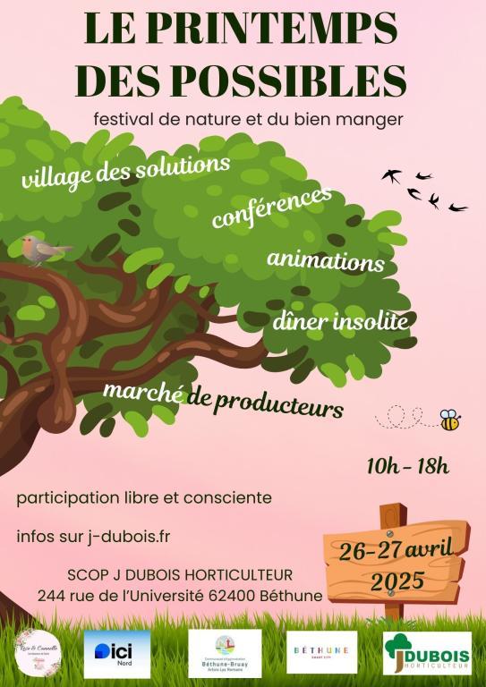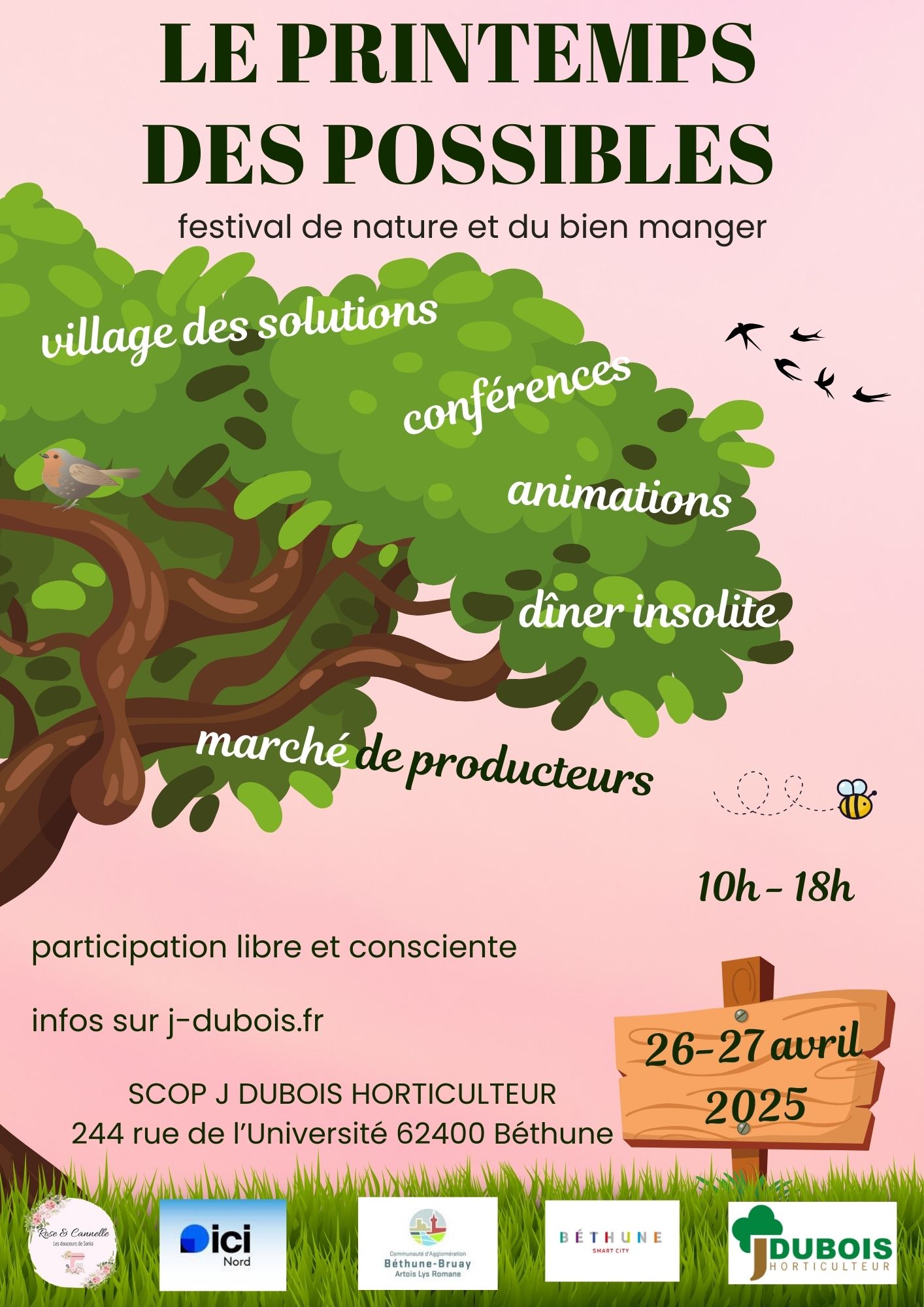 Du 26 Avr - 27 Avr SCOP J DUBOIS Horticulteur / Béthune 10h - 18h Événement Le printemps des possibles Festival de nature et du bien manger Ajouter au calendrier Public : Tout public Village des solutions Marché de producteurs Conférences Animations Et dîner insolite Localiser Choice of plan Fermer Precedent Retour à la liste Suivant