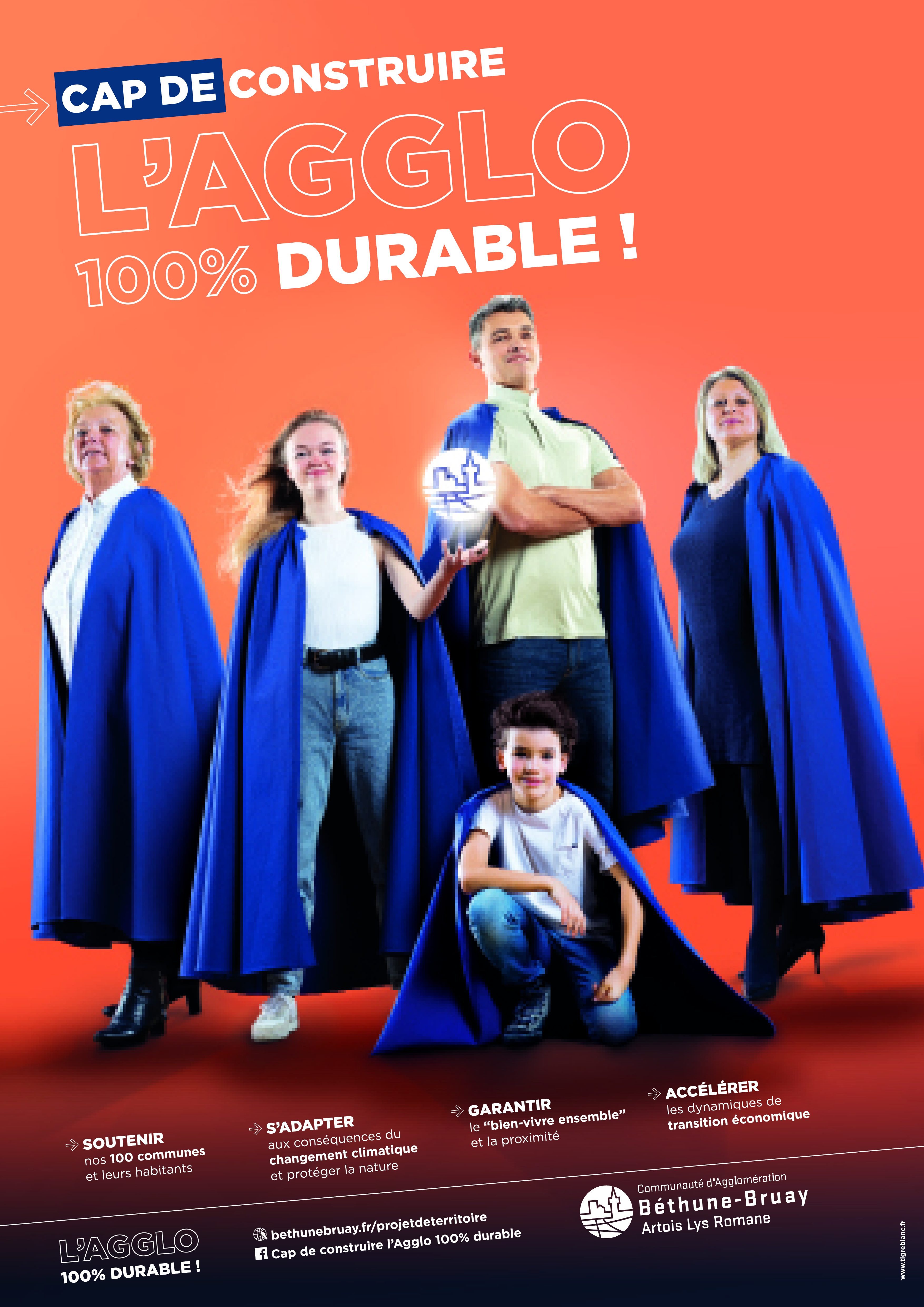 Vous les avez vus ? Dans plusieurs abribus, les bus du réseau Tadao, sur les réseaux sociaux ou encore dans la presse…Ils sont cinq habitants-super héros vêtus d’une cape bleue et vous invitent à construire l’Agglo 100% durable… Non il ne s’agit pas du prochain Marvel qui sort en salle, mais bien de la nouvelle campagne de communication de l’Agglomération sur son projet de territoire 2022-2032.