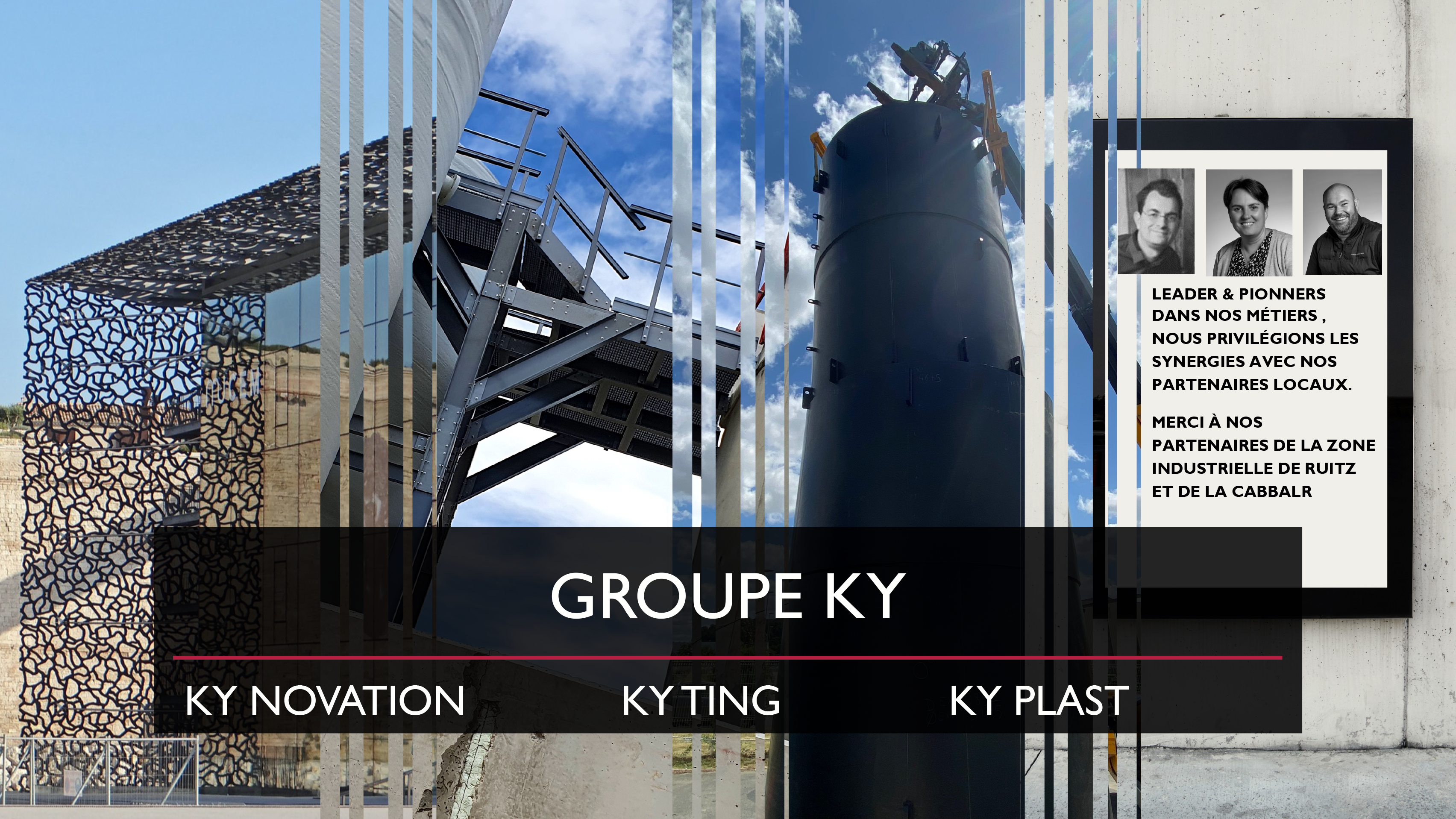 KyPlast est experte dans la chaudronnerie de cuve de stockage et tuyauterie plastiques sur des réseaux de transferts de fluides hautement corrosifs ou contaminés. Cette entreprise s’insère dans le Groupe Ky qui a observé la naissance de filiales conjointes telles que KyTing, spécialiste de l’ergonomie au travail des entreprises ; et KyNovation, qui axe son activité dans l’assemblage et la vente de pièces composites.